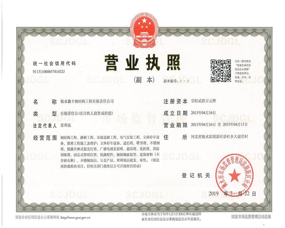 衡水鑫豐鋼結構工程有限責任公司建于 2003年, 技術力量雄厚 , 專注生產鋼結構鐵塔系列產品 。本廠具有鋼、鋁塔設計,制作以及鑄造、鉚焊、鍛壓、熱鍍鋅、防腐等綜合制作能力,在設計、制作、安裝以及專用設備方面有豐富的經驗。